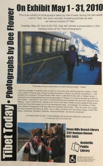 An exhibit of photographs taken by Dee Flower during her two week visit to Tibet. Her work includes revealing portraits as well as various scenes of Tibet